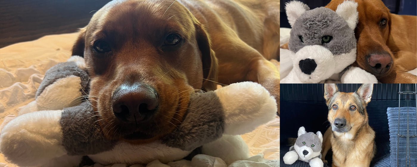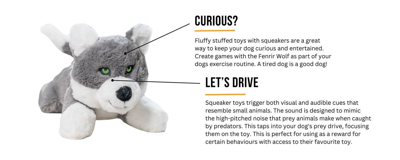 The Fenrir Wolf Toy has a hidden squeaker inside that is activated when pressed or bitten. Take your dog's excitement and intrigue to the next level with this enticing sound. If your dog is especially fond of the Fenrir Wolf, we suggest getting a second toy and using them for recall training. Simply throw one toy for your dog to fetch, then use the squeak of the second toy to entice them back.